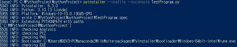 그리고 다시pyinstaller --onefile --noconsole  TestProgram.py를 써보면 다음과 같이 exe파일이 만들어지는 것을 볼 수 있다.