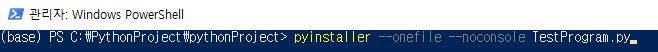 아나콘다 파이썬을 쓰는데 TestProgram.py를 실행 파일로 만들려고 Window PowerShell에서